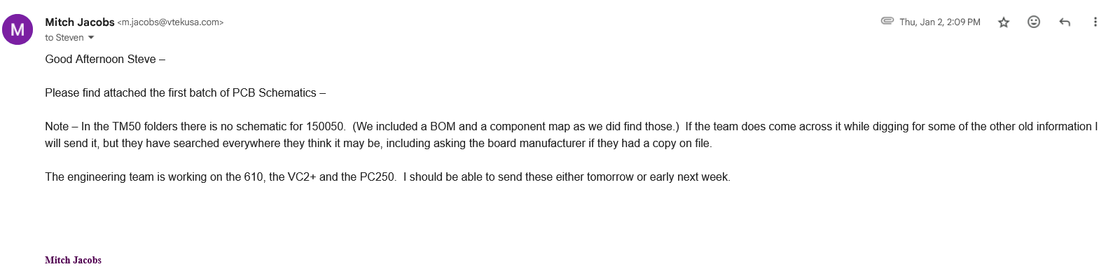 Since V-tek is based in Minnesota, a #RightToRepair state, there may be a pathway to push for fair and reasonable access to the necessary documents, tools, and embedded software aka firmware. Are there any repair shops in Minnesota interested in submitting a request for service information for all TM-50 models manufactured from July 1, 2021, onward? This request may need to be followed up with a report to the Minnesota Attorney General Anti Trust Report if V-tek resists. I have made my official request for Oregon July 01 2015 to Present and California.
