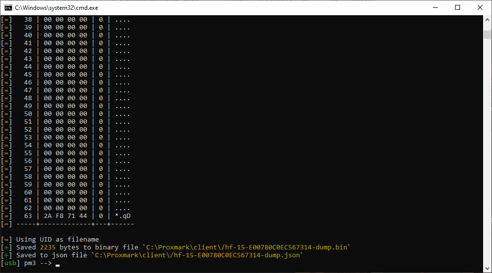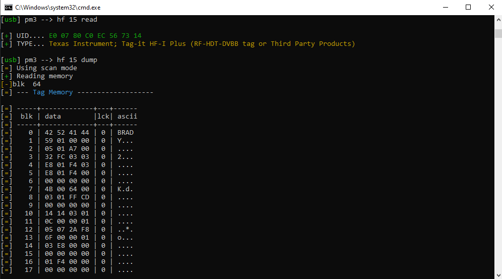Then We Type “HF 15 Dump” it will Dump the Tag As you will see no locks are set this data is in the clear.