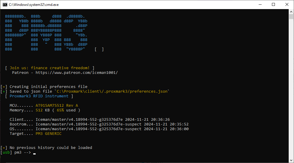 We Start with obtaining a Proxmark3 RFID Reader/Writer install was a bit difficult bit once installed. You get This Screen!