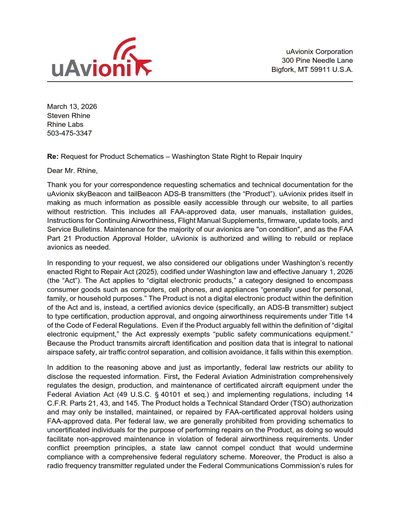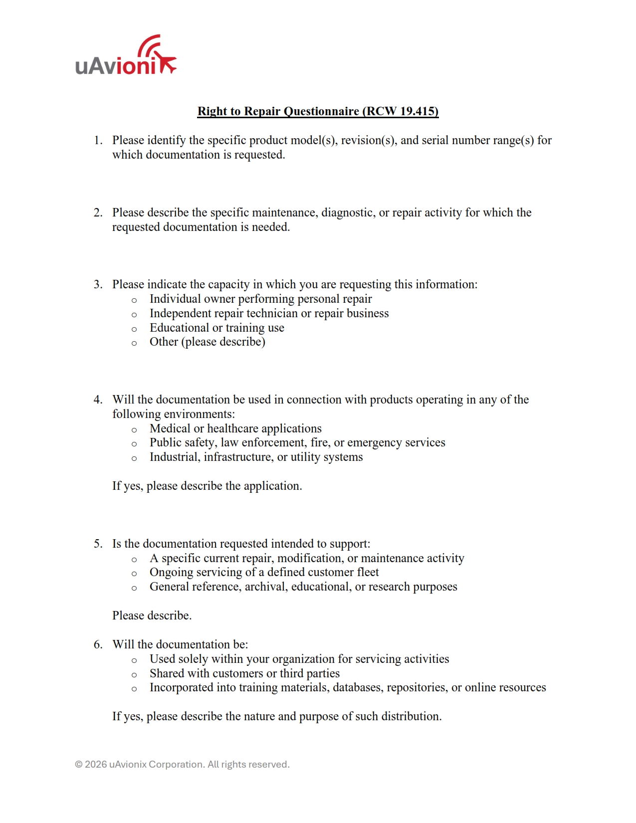 I made my Request Under Washington States Right to Repair law RCW 19.415 to Uavionix there customer service dismissed the request and finally with enough presistance I was contacted by Uavonix Attorney Benjamin Morse I made my request with him and he sent me a Questionnaire.