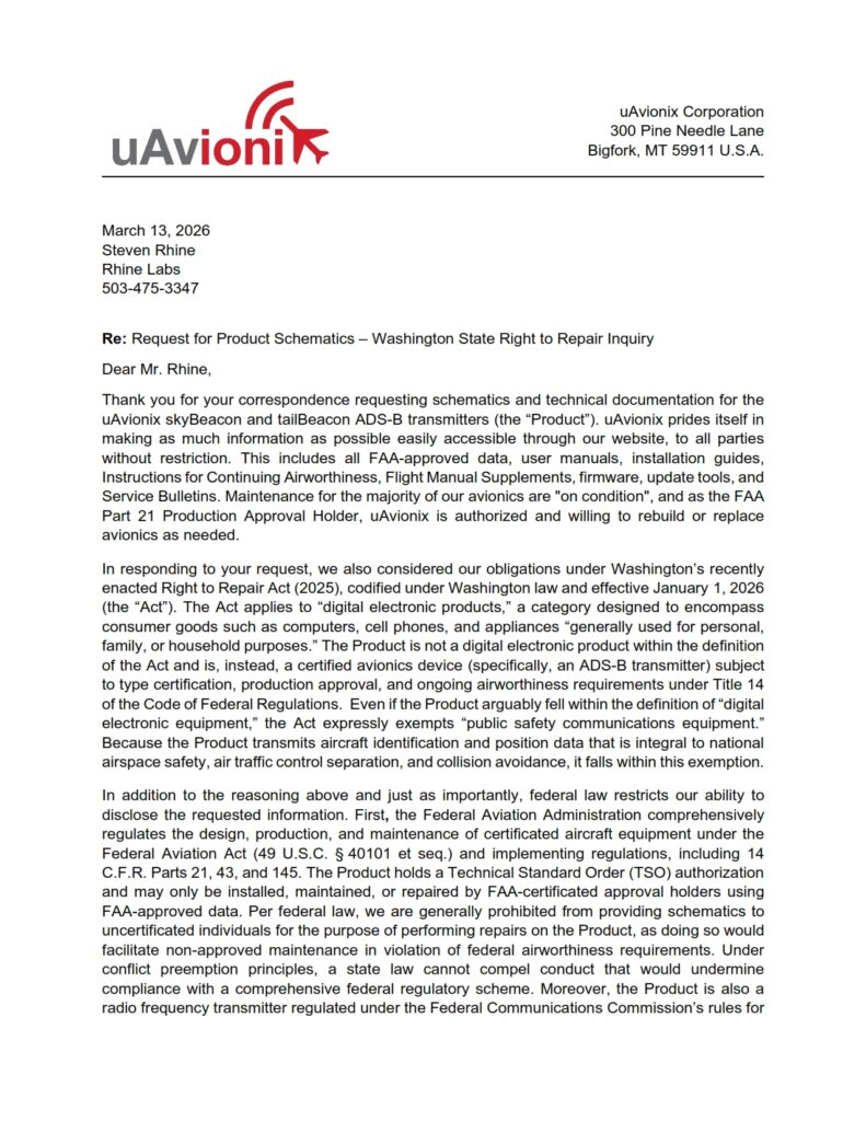 On March 13th I finally got the denial for the requested documentation Schematics and Bill of Materials for the General Aviation ADSB products at are common failure many complaints on the groups and forums.